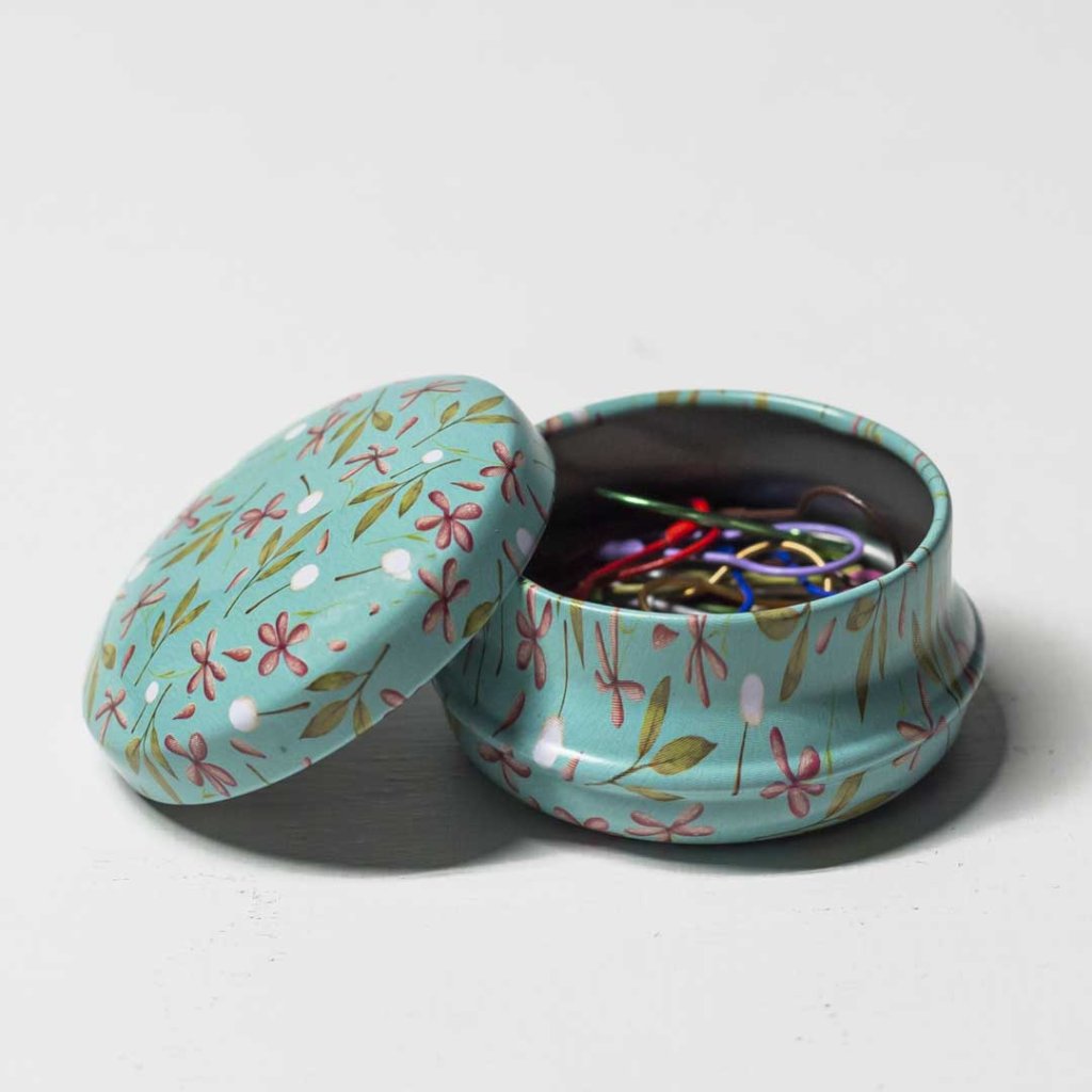 Součástí sady je kovová krabička a 20 ks kovových značek různých barev.