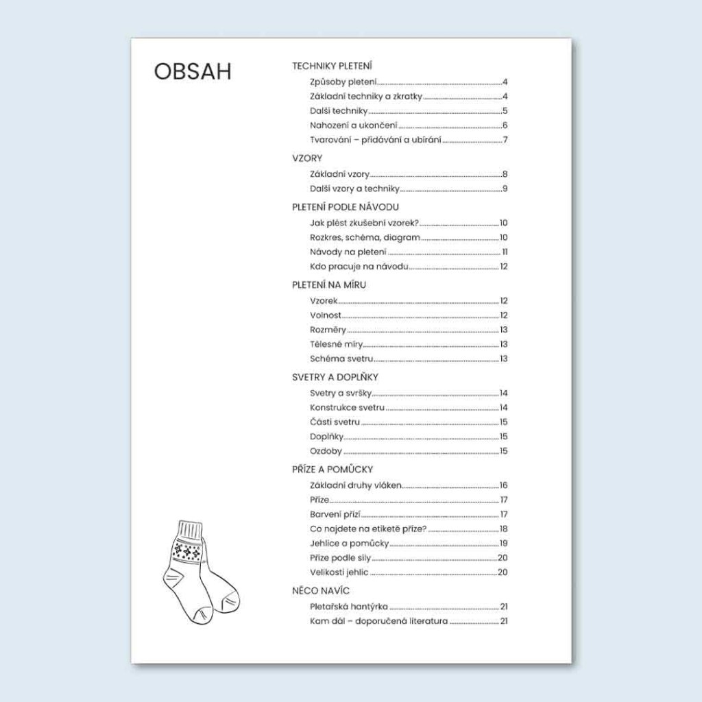 Pomůže vám porozumět českým i anglickým návodům, zorientovat se v technikách, materiálech a přízích a nabídne praktické tipy. Najdete v něm spoustu užitečných informací – například jaký je rozdíl mezi „swatch“ a „gauge“, jak se jmenují jednotlivé části svetru, nebo co znamená plést západním způsobem. Zkrátka základy, které se hodí každému, kdo vezme jehlice do ruky.